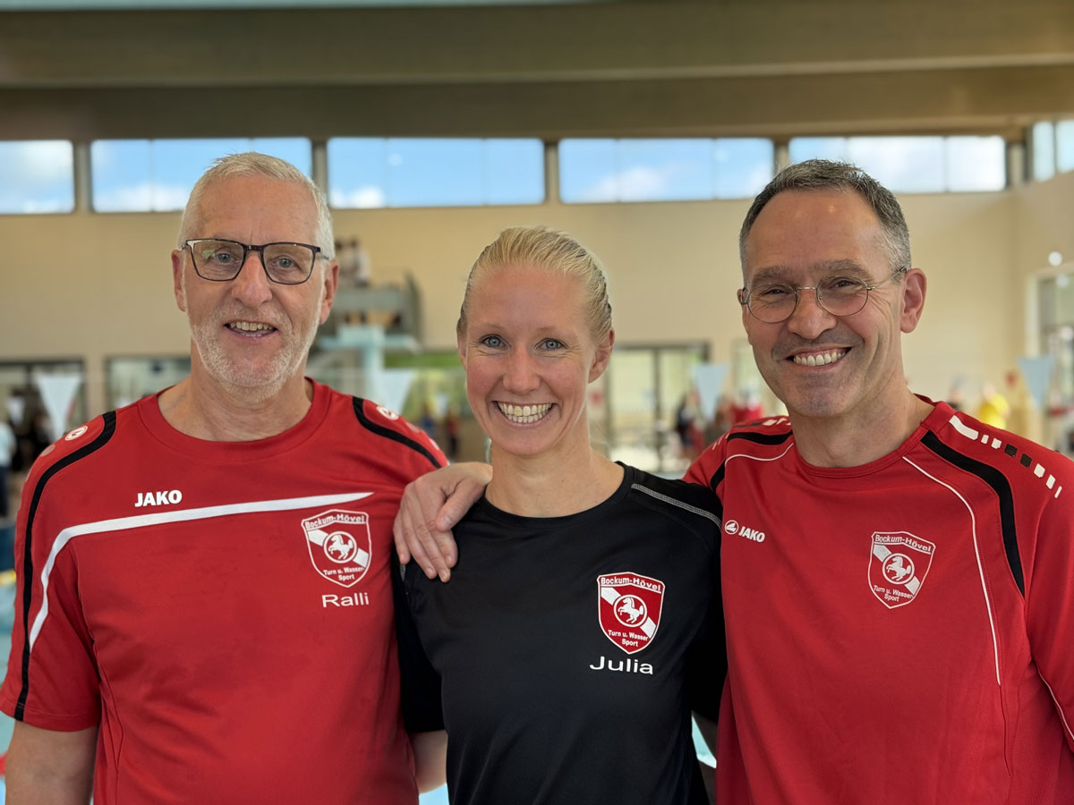 Julia Rüsenberg (AK40) wurde NRW-Meisterin über 100 Meter Rücken in einer starken Zeit von 1:13,58 Minuten. Eine Silbermedaille erschwamm sie sich außerdem über die 50 Meter Freistil in 0:30,87 Minuten und Bronze über 50 Meter Schmetterling in 0:34,24 Minuten. Den zweiten Titel für den TuWa sicherte sich Trainer Ralf Kraienhemke (AK65) über 100m Freistil in 1:14,22 Minuten nach einem spannenden Rennen mit Zielrichterentscheid zu seinen Gunsten. Außerdem schlug er über die 50 Meter Schmetterling in 0:35,36 Minuten als dritter an und er erschwamm sich ebenfalls die Bronzemedaille über 50m Freistil in 0:32,52 Minuten. Guido Obrikat (AK50) erreichte eine Bronzemedaille über 50m Freistil in 0:31,89 Minuten und über 100 Meter Rücken in 1:27,12 Minuten. Über 100m Freistil reichte es nur zu Platz 4 in 1:11,54 Minuten und damit knapp an den Medaillenrängen vorbei.