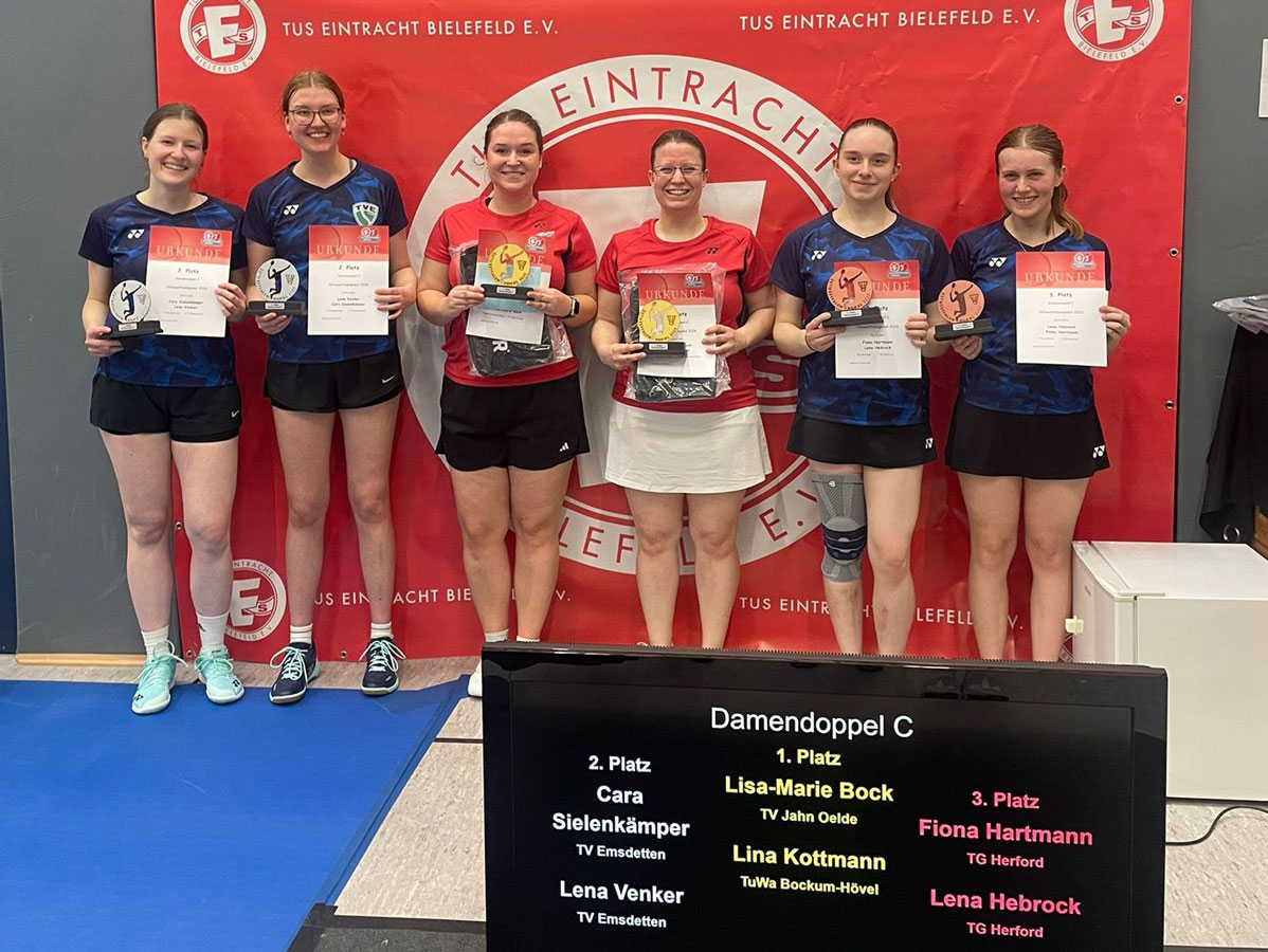 Im Halbfinale setzten sich das Duo vom TuWa Bockum-Hövel und TV Jahn Oelde dann souverän mit 21:12 und 21:5 gegen Anne und Maria Wochnik (DJK Adler Brakel/BC Phönix Hövelhof) durch und zogen ins Endspiel ein. Dort trafen sie auf Cara Sielenkämper/Lena Venker (TV Emsdetten), die sie ebenfalls sicher mit 21:14 und 21:13 bezwangen und nach einem langen Turniertag ihre verdienten Pokale und Urkunden erhielten. Der dritte Platz im Damendoppel ging an Fiona Hartmann/Lena Hebrock von der TG Herford.