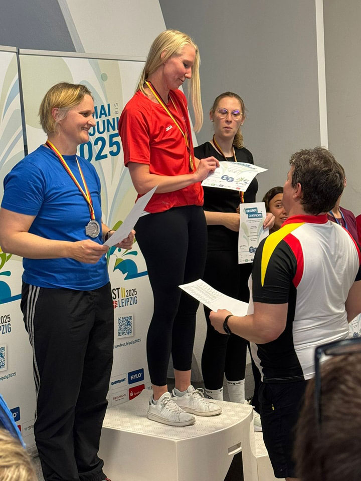 Julia Rüsenberg vom TuWa Bockum-Hövel ist erneut Deutsche Meisterin im Schwimm-Fünfkampf. Die Deutschen Mehrkampfmeisterschaften wurden in diesem Jahr im Rahmen des Internationalen Deutschen Turnfestes in Leipzig ausgetragen. In der Altersklasse 30+ trat Julia Rüsenberg als Titelverteidigerin an. Trotz der ungewohnten 50-Meter-Bahn brachte sie über 100 Meter Rücken, 50 Meter Schmetterling und 50 Meter Freistil schnelle Zeiten ins Wasser und war auch beim 25-Meter-Streckentauchen die Zweitschnellste des Feldes. Zwei saubere Sprünge vom 1-Meter-Brett machten die Titelverteidigung mit 59,179 Punkten perfekt. In der selben Altersklasse zeigte auch Verena Jürgens einen durchweg starken Wettkampf. Mit 49,962 Punkten verbesserte sie sich im Vergleich zum Vorjahr um mehr als zwei Punkte und freute sich über den vierten Platz.