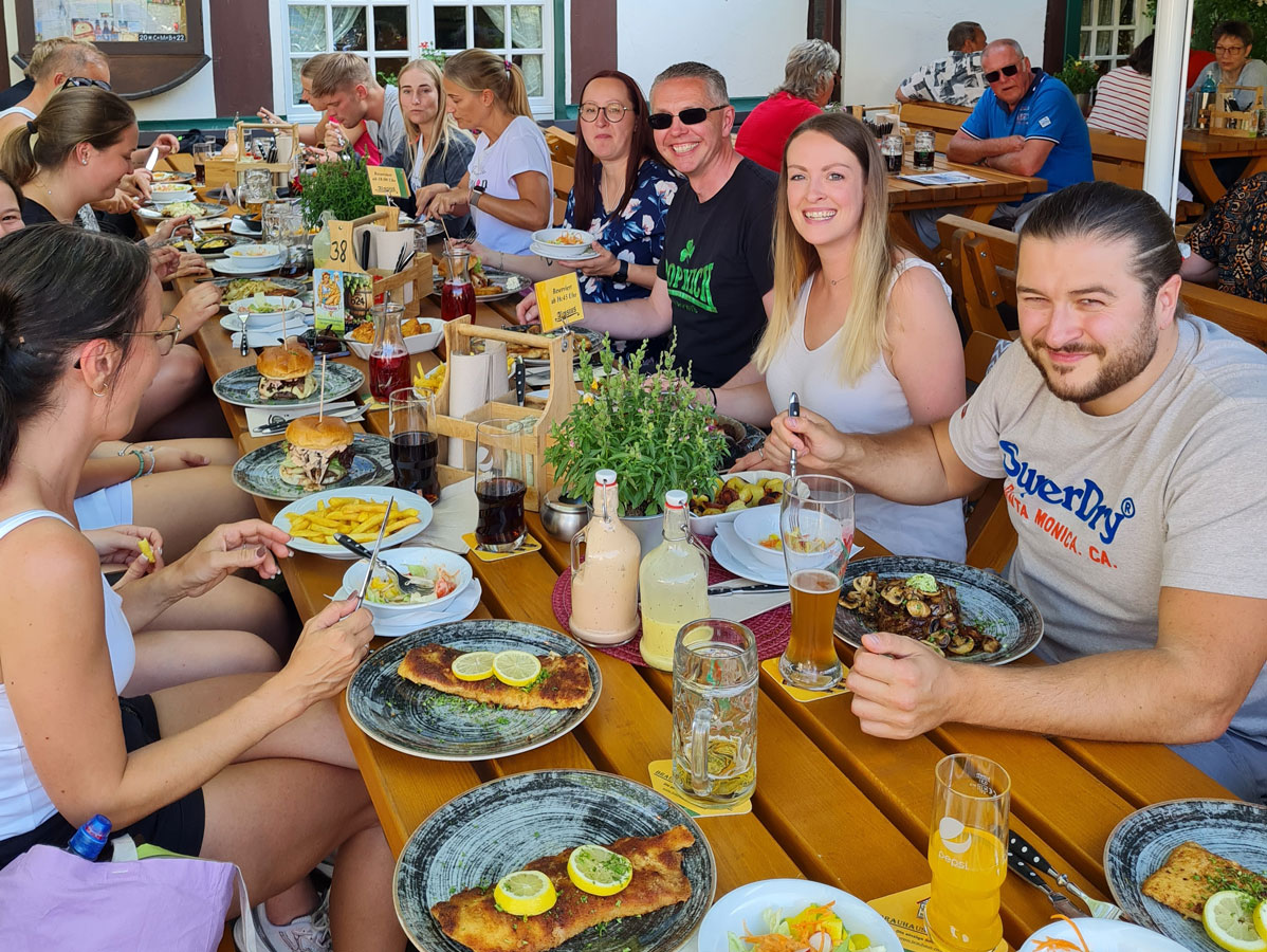 In Soest angekommen fuhren wir über den Ring zum Restaurant „Aloisius“, wo im Biergarten bereits für 17 Personen ein Tisch reserviert war. Bei schönstem Sommerwetter konnten wir uns von der Fahrt erholen und uns bei leckerem Essen stärken. Der Rückweg wurde dann getrennt angetreten. Eine Gruppe machte sich auf den Weg zum Bahnhof, um mit dem Zug zurück nach Bockum-Hövel zu fahren, die andere hatte noch nicht genug Sport gemacht und strampelte den Weg zurück, so dass die TuWa-Badmintonspieler an diesem Tag zwischen 74 und 90 Kilometer mit dem Rad zurücklegten. Wir sind also fit und die neue Saison kann kommen!