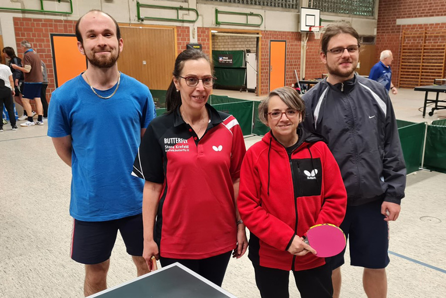 Unsere zweite Mannschaft (Bild links) hatte beim Training am Donnerstag einen Fototermin für ein Mannschaftsfoto und am Freitag nahmen Jeannette Feige, Dajana Gizdic, Philipp Plocziki und Stefan Stürmer bei einem Vergleichswettkampf für Hobbyspieler (Bild rechts) bei der DJK Germania Kamen teil, um Erfahrungen zu sammeln und sich mit anderen Sportlern zu messen. Der lange Abend lohnte sich für die Bockum-Höveler, die sich nach Erfolgen über Arnsberg (6:4) und Kamen (6:1) den Turniersieg sicherten.