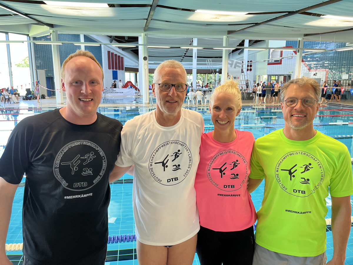 Julia Rüsenberg konnte ihren Titel von 2022 verteidigen und gewann die Altersklasse 30 mit 59,271 Punkten und deutlichem Vorsprung von 4,8 Punkten. Sie schwamm 100m Rücken in 1:14,20 min, 50m Freistil in 0:31,8 min und 50m Schmetterling in 0:34,8 min und zeigte auch im Kunstspringen eine sehr gute Leistung. Sie wurde insgesamt zum vierten Mal Deutsche Meisterin. In der männlichen Altersklasse 30 belegte Jens Hirsch einen guten Platz 6 mit 50,174 Punkten, knapp mit 0,6 Punkten hinter Platz 5. Er zeigte gute schwimmerische Leistungen mit 100m Freistil in 1:06,70 min, 50m Schmetterling in 0:35,8 min und 50m Brust in 0:38,4 min. Matthias Hirsch belegte Platz 8 mit 49,141 Punkten. Er schwamm 100m Freistil in 1:09,5, 50m Schmetterling in 0:33,9 min und 50m Brust in 0:38,5 min. Trainer Ralf Kraienhemke erreichte bei seiner 42sten Teilnahme an den Deutschen Schwimm-Mehrkampfmeisterschaften in der gleichen Altersklasse Platz 9 mit 45,601 Punkten. Er schwamm 100m Freistil in 1:13,50 min, 50m Schmetterling in 0:35,9 min und 50m Brust in 0:41,0 min und überzeugte auch im Kunstspringen.